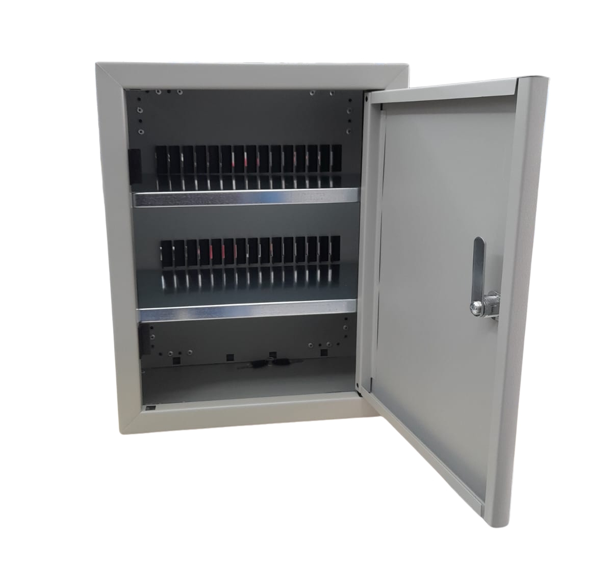 Compatto, funzionale e resistente è dotato di n. 2 ripiani interni in lamiera zincata con griglia di separazione che permettono una sistemazione pratica e ordinata dei dispositivi.